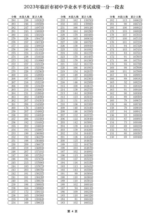 2023临沂市中考一分一段表公布